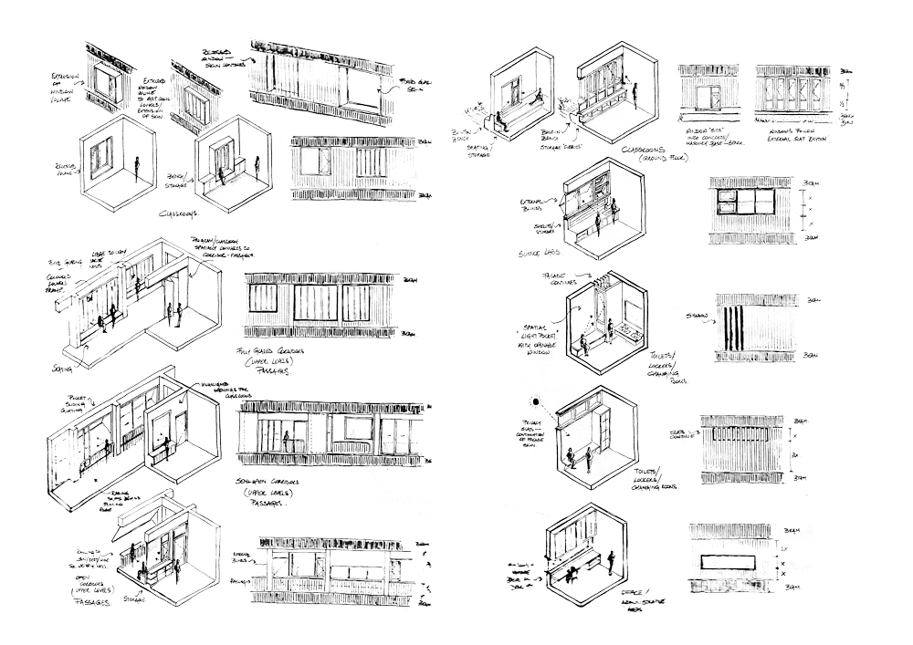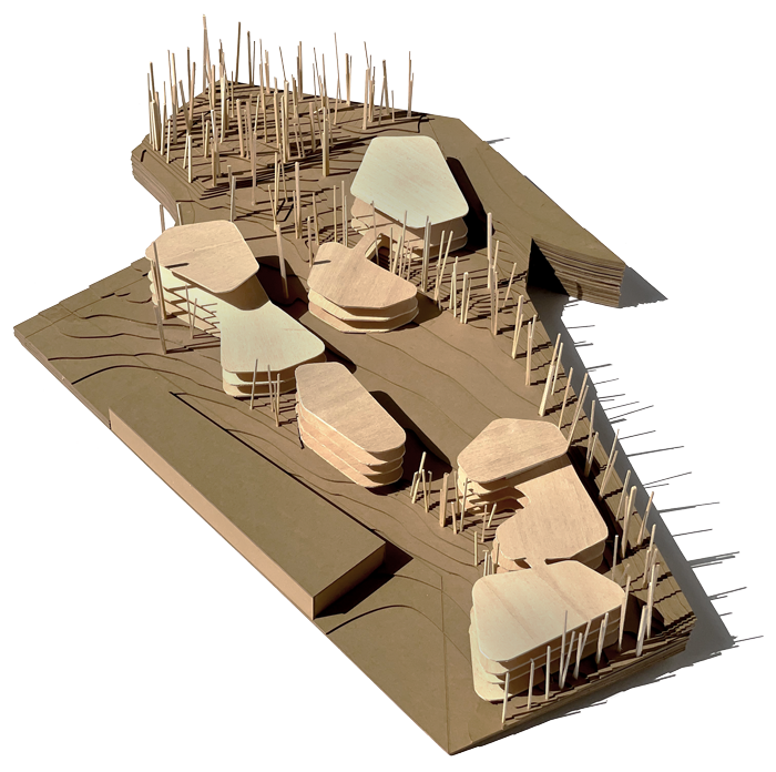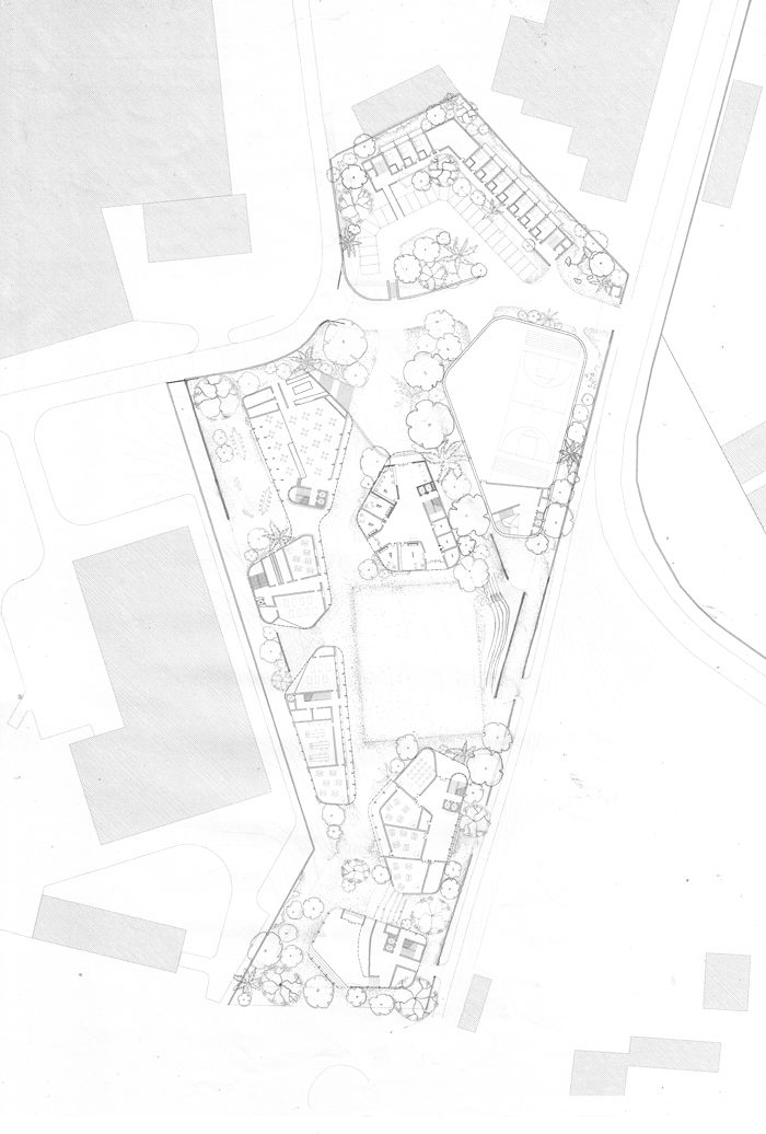 Anchor elements such as the gymnasium, cafeteria, library, and administrative offices are strategically arranged across the site with orbiting secondary learning spaces, classrooms, and labs positioned around them to create networks of interconnected zones. This layout encourages students to circulate throughout the campus and encounter a variety of spatial and social conditions that offer moments of reflection, interaction, and informal learning.