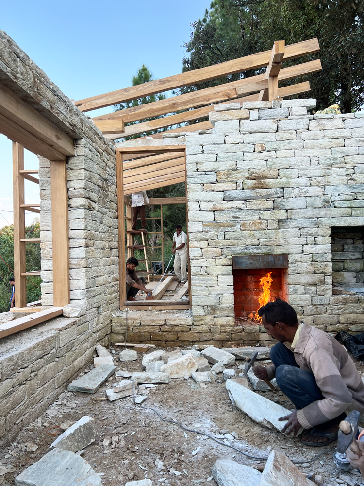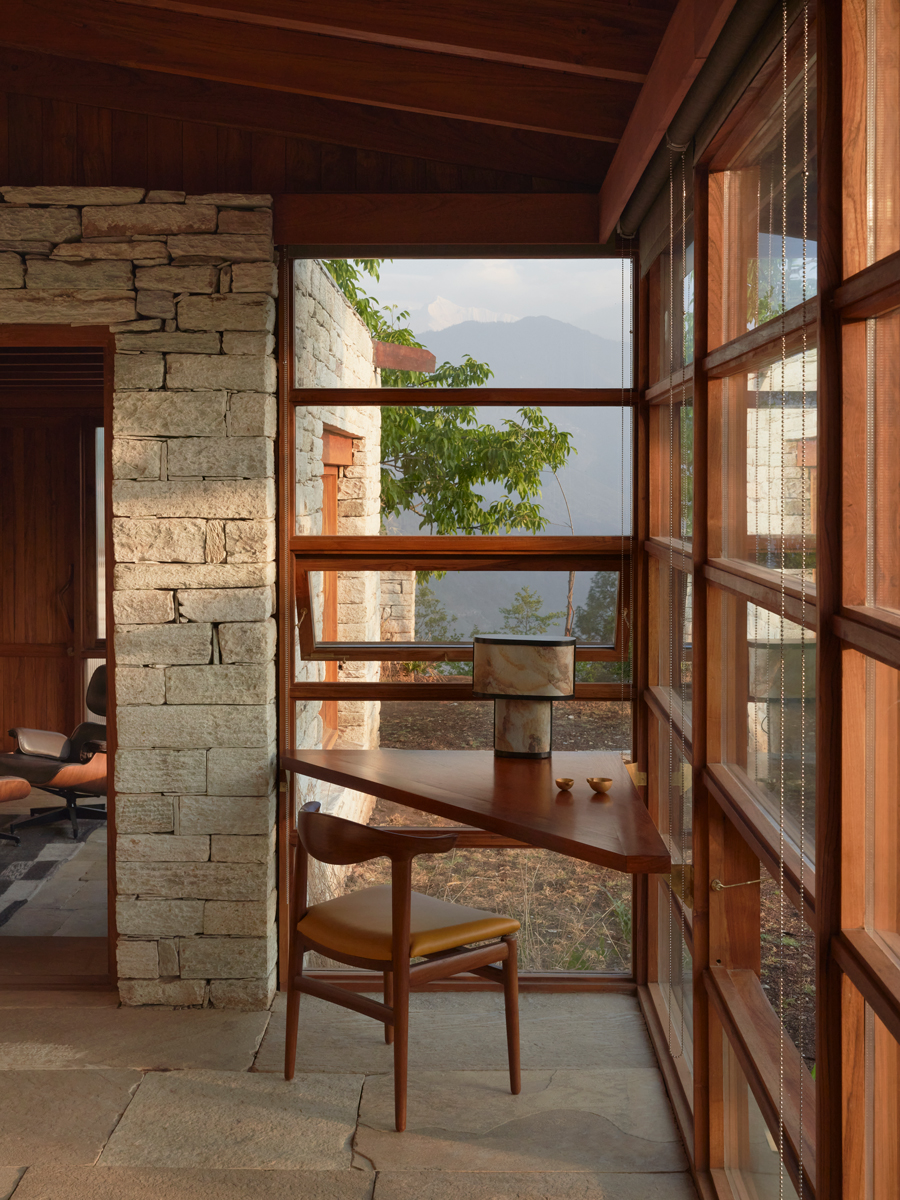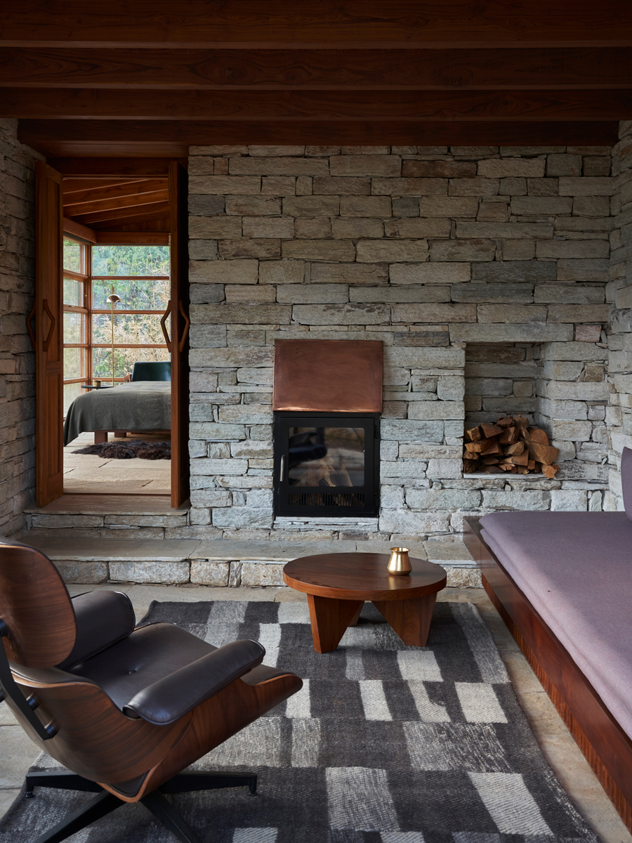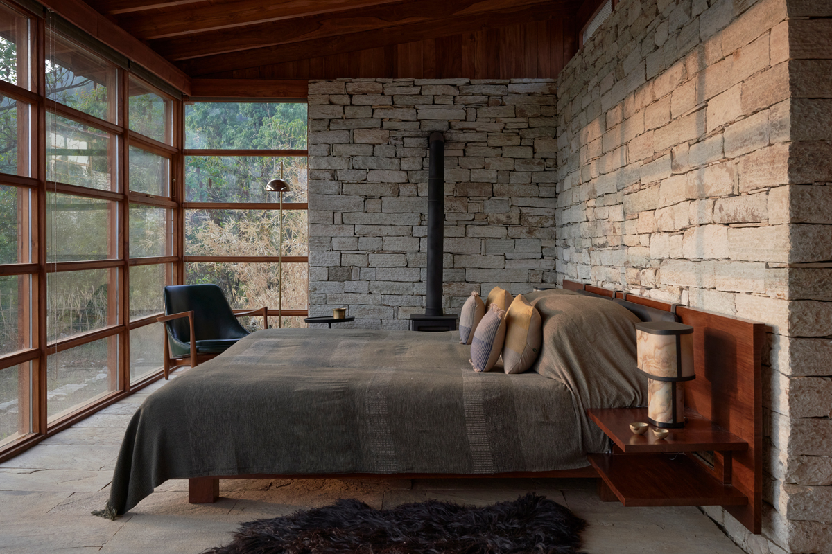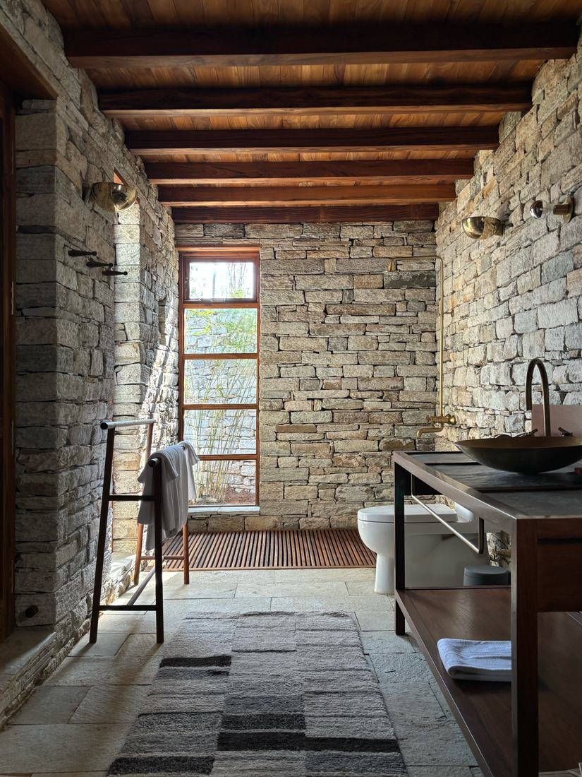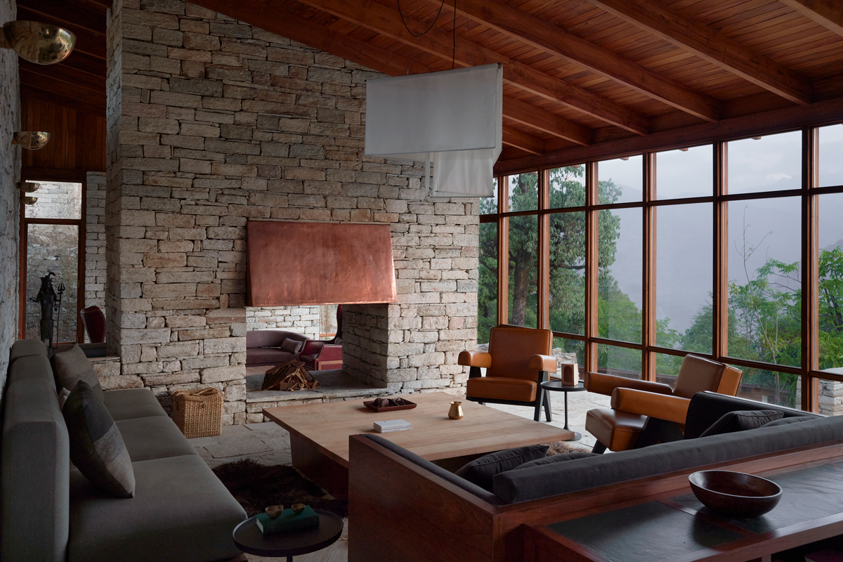 The structures were meticulously crafted by onsite teams of artisans, using a blend of reclaimed and locally sourced stone, timber, and glass. Handcrafted copper tiles cap each building, while interiors feature rustic stone and timber complemented by bespoke furnishings. Custom brass lighting and handwoven textiles enrich the spaces, with sheep and yak wool carpets from Ladakh and organic Kala cotton bedspreads and cushions from Kutch.
