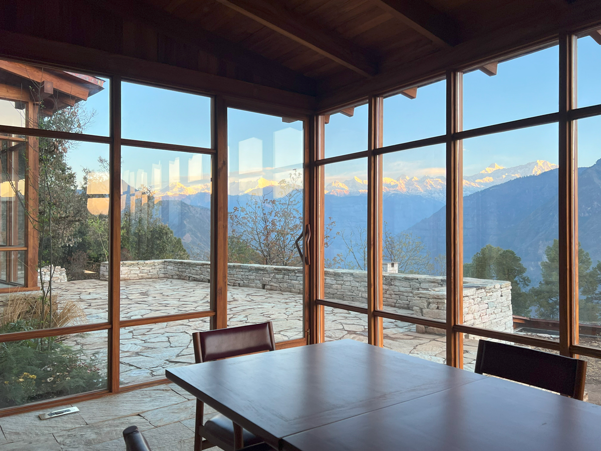 Nestled within the stepped agricultural terraces at the edge of a forest, Prana overlooks the expansive Nanda Devi Peak within the Himalayan mountain range. This collection of understated guest dwellings offers uninterrupted views of the central Kumaon range of Uttarakhand to the north and west and the Nepalese Himalayas to the east. A ten-hour drive from the nearest airport, the remote location is finally reached either on foot or horseback via a steep mountain trail that winds its way through picturesque forests, villages, streams, farms, and temples.
