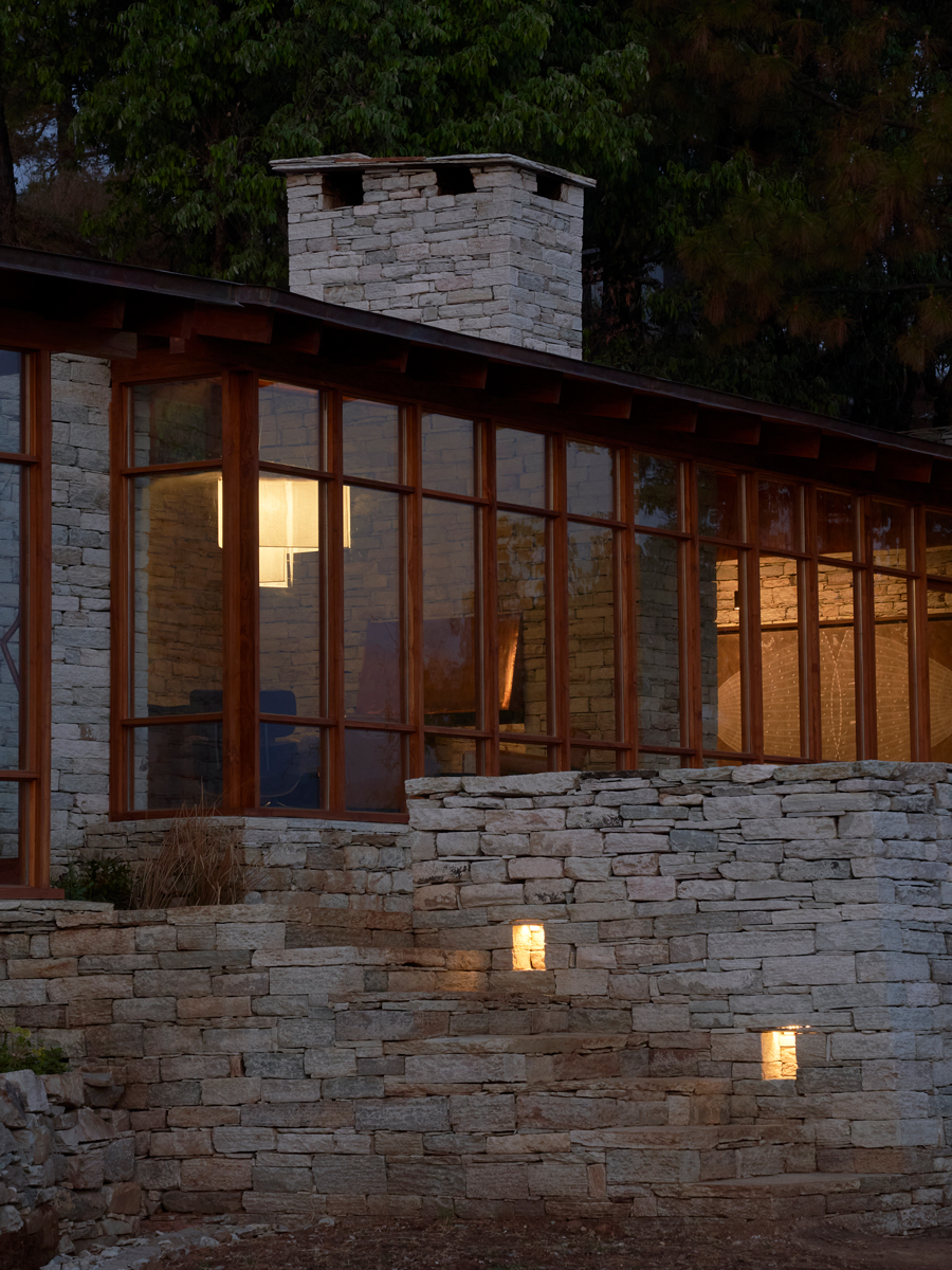 Prana reimagines and expands upon the original concept of Shakti Leti 360, developed by Studio Mumbai Architects in 2007 for a site further up the valley. Incorporating dry-stacked stone masonry and interlocking timber joinery, materials from the dismantled original project were carefully transported and repurposed for this new terrain. Adapting to the site and an enhanced hospitality program, the project now includes additional guest suites, communal living and dining spaces anchored by large stone fireplaces, guest and staff kitchens, a forest sauna and spa, and a stone yoga terrace.